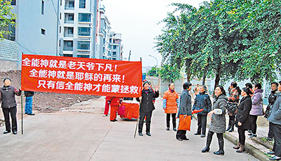 ■「全能神」組織潛入大陸福州社區拉橫額宣傳。網上圖片