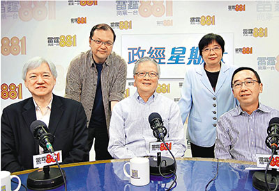 ■ 董耀中(前左)、方剛(前中)、梁兆基(前右) 擔心調整個人遊政策,對香港弊多於利。