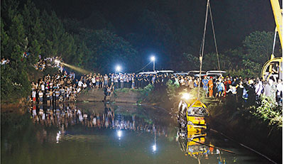 ■肇事校巴打撈出水,11名遇難者遺體全部找到,其中幼兒8名,成人3名。 中新社