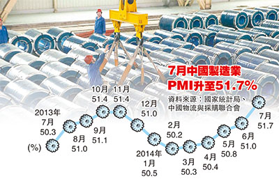 香港文匯報訊(記者 海巖 北京報道)受生產和新訂單指數大幅上漲推動,中國7月官方和匯豐製造業PMI雙雙創下年內高點。國家統計局數據顯示,7月官方製造業PMI為51.7%,比上月上升0.7個百分點,為今年以來最大升幅,亦是連續第5個月回升。專家認為,製造業穩中向好趨勢更加明顯,尤其小企業PMI回升明顯成為亮點,經濟回升態勢初現。