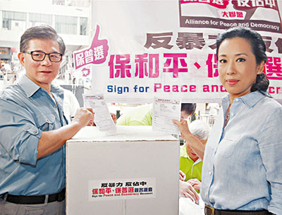 ■羅康瑞昨偕同朱玲玲到街站簽名反「佔中」。 潘達文 攝