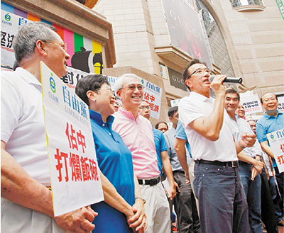 ■自由黨昨在銅鑼灣設置街站,呼籲市民參與反「佔中」網上簽名。 劉國權 攝