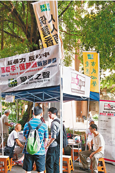 ■「愛港之聲」計劃增設「夜站」,方便下班人士簽名支持反「佔中」。 黃偉邦 攝