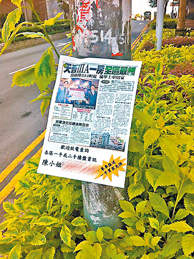 香港文匯報訊(記者 蘇洪鏘)將軍澳大盤天晉IIIA期推售在即,讓市場拭目以待,惟該盤目前尚未獲批預售,但已有代理急不及待偷步宣傳,繼日前有聲稱「首30名入票者可獲回贈」的單張外傳後,昨天將軍澳站附近的欄杆再出現宣傳該盤的單張。地產代理監管(簡稱地監局)昨日回應時表示,對於再現宣傳天寘IIA期單張,該局正了解和跟進事件。
