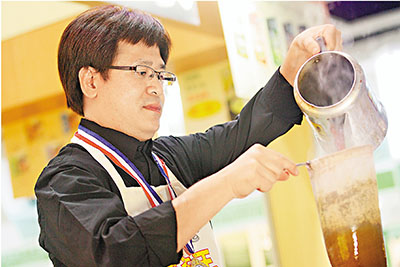 ■具35年沖奶茶經驗的香港代表周漢文奪得「國際金茶王大賽2014」總決賽冠軍。 莫雪芝 攝