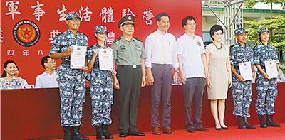 香港文匯報訊(記者 鄭伊莎)為期15天的第四屆「香港大學生軍事生活體驗營」昨日圓滿結束。結業禮上,行政長官梁振英及夫人梁唐青儀、中聯辦主任張曉明、解放軍駐港部隊司令員譚本宏少將、外交部駐港特派員公署副特派員姜瑜等主禮。92名來自全港14所大專院校的學生,穿蚞蒚籅滌g彩軍服,為嘉賓表演軍體拳及列隊匯報。他們精神抖擻、英姿煥發,展現軍人的專業形象。學員說,體驗營令他們明白到保家衛國的重要,學會團結一致。