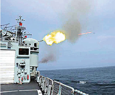■解放軍軍艦在黃海實彈射擊。 資料圖片