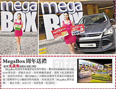 MegaBox¼y¯¬©P¦~»x¼y¡A¥Ñ§Y¤é°_¦Ü11¤ë16¤é±N·Ç³Æ¦U¶µ©P¦~¤j©â¼ú¤Î¤@³s¦êºë±m¬¡°Ê¡A¨Ã°e¥X¤Q¸U¥÷§«~¦^õXÅU«È¡A»PÉ]¥Á¦P¶P©P¦~»x¼y¡CMegaBoxÁ`ºÊ¤åÀRªÛªí¥Ü¡G¡u¬°¼y¯¬©P¦~»x¼y¡A°Ó³õ±N·|Á|¦æ©P¦~¤j©â¼ú¡C¤j®a®ø¶Oº¡«ü©wª÷ÃB¡A§Y¦³¾÷·|°Ñ¥[©P¦~©¯¹B¤j©â¼ú¡AŨ«Ford KUGAÁo©ú¥|ÅX¡]»ùÈHK$249,900¡^¤Î¨ä¥LÂ×´I§«~¡I¦Ó¥B¡A¥Ñ²{¦b°_¡A¤j®a¥i°Ñ¥[©P¦~§Y©â§Y¤¤¼Öº¡FUN¡A¦³¾÷·|Ũú¤£¦P°Ó¤á²{ª÷¨é¤Îºë¬ü§«~¡A¨C¤é§ó°e¥XÀ£¶b¤j¼úHK$1,000Áʪ«²{ª÷¨é¡C100,000¥÷§«~½à¤£°±¡A¤H¤H¦³¥÷¡A¥Ã¤£¸¨ªÅ¡I°Ó³õÁÙ»P¤@²³ÅU«È¤À¨É³ß®®¡A©ó¤µ¤Ñ¡]9¤ë28¤é¡^°e¥X¹L¤d¥÷´L¶Q¥Í¤é§²°¡A¥H¦^õXÅU«Èªºªø´Á¤ä«ù¡C§A¥u»Ý©ó¬¡°Ê·í¤é¬ï¤W¬õ¦âªA¹¢¡A§Y¥i§K¶OÀò±o»ùȰª¹FHK$2,000ªº´L¶Q¥Í¤é§²°¤AÓ¡C¡v