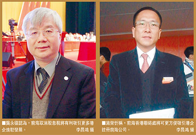 因股息稅事關所有進駐前海的港企,深圳市政協委員、畢馬威中國華南區首席合夥人龔永德和深圳市政協委員、恆通資源董事長施榮忻均認為,前海宜逐步降低直至免除股息稅,這樣可以增強港企投資前海的吸引力。