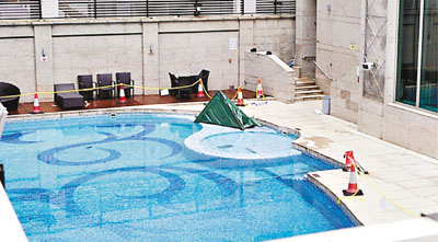 ■半山羅便臣道跳樓菲傭死在泳池,警方調查期間以帳幕將屍體遮蓋。