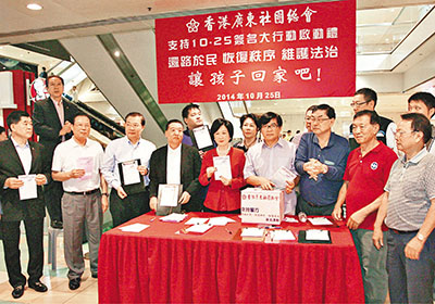 香港廣東社團總會昨日在上環信德的簽名站舉行「支持10.25簽名大行動啟動禮」,民建聯主席譚耀宗,新民黨主席、立法會議員葉劉淑儀和立法會議員連同總會多位首長出席,一同高呼「還路於民 恢復秩序 維護法治」,呼籲香港市民站出來簽名,支持警方執法。