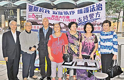 ■多名原港區全國人大代表昨日專程到中環畢打街簽名支持警隊執法,並呼籲示威者還路於民。李自明 攝