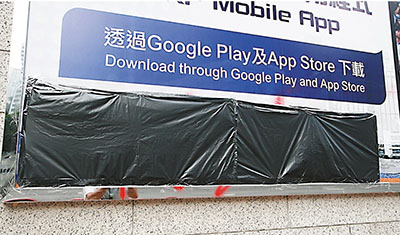 ■遭人塗鴉的警察總部外牆廣告牌,事後以膠布遮蓋。劉友光 攝