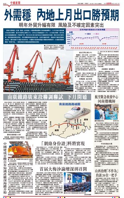 香港文匯報訊(記者 海巖 北京報道)中國海關總署昨日發佈數據顯示,10月內地外貿延續9月的良好勢頭,當月外貿同比增長8.4%,其中出口增速達到11.5%,大大高出預期;但外貿出口先導指數較前一月略微下滑,預示未來2到3個月的出口增速將有所放緩。對於未來外貿形勢,商務部最新報告預計,明年國際環境或略有改善,但回升幅度有限,風險和不確定因素較為突出;國內經濟下行壓力依然存在,中國對外貿易將面臨外需難有明顯回升、外貿競爭優勢轉換「青黃不接」、貿易摩擦依然嚴峻複雜等諸多挑戰。
