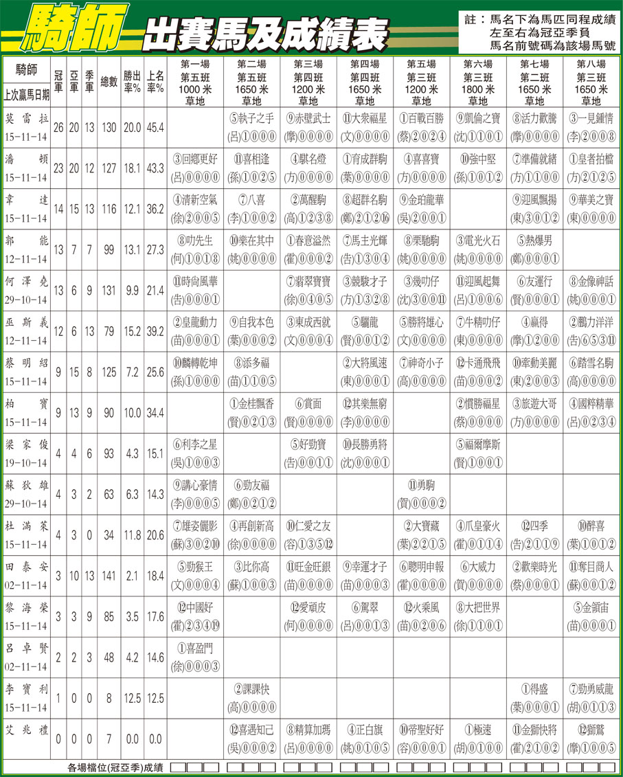 練馬師出賽馬及成績表 (2014-11-19) (圖)