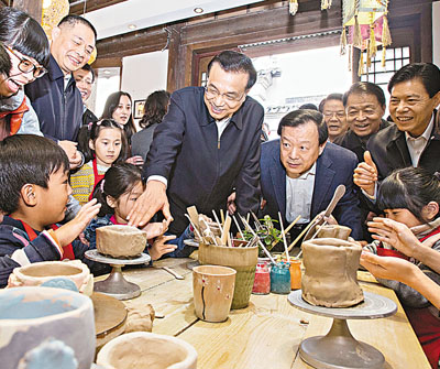 ■在京杭大運河杭州拱宸橋段一家陶藝店中,李克強同孩子們親切交流。新華社