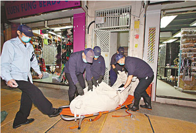 ■大南街服藥再燒炭齊死的兩名女子遺體舁送殮房。