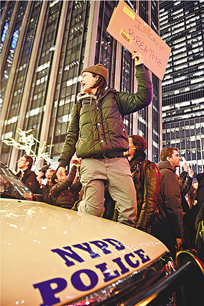 ■示威者站在警車上高舉「我透不過氣」標語。 新華社
