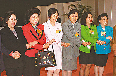 ■1997年12月8日,香港特區第九屆全國人民代表大會代表選舉會議在香港舉行全體會議,正式選出36位港區九屆全國人大代表。圖為港區全國人大代表女候選人范徐麗泰(右三)、譚惠珠(右一)等會前手拉手在一起合影。資料圖片