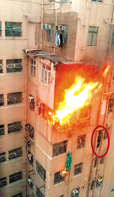 ■遭縱火單位噴出烈焰,一名男子冒險爬出外牆,緊抓水渠逃過大難(紅圈示)。讀者提供