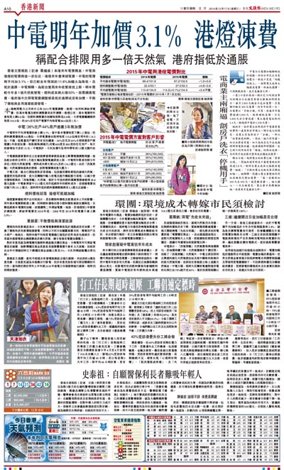 中電總裁潘偉賢昨在立法會經濟發展事務委員會上解釋電價調整理據,指為配合政府自明年1月起大幅收緊發電廠排放上限,中電明年需採用較今年多近1倍的天然氣發電,燃料成本將大增50%至約154.5億元。由於「西氣東輸」天然氣價格遠高於燃煤,故對電價構成重大壓力。