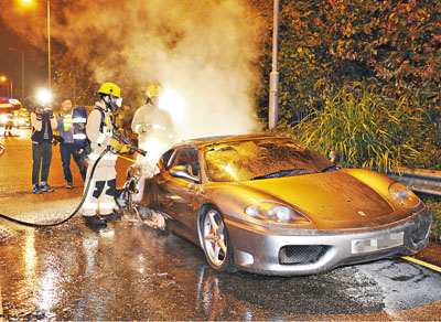 香港文匯報訊 (記者 杜法祖)將軍澳發生超級跑車「自焚」意外。一輛法拉利跑車昨晨在將軍澳隧道公路上斜途中,車尾突起火及傳出爆炸聲,司機及時棄車報警,其間跑車濃煙湧現,消防員趕至迅開喉將火救熄,事件中無人受傷,但跑車車尾嚴重焚毀恐會報廢。