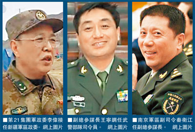 香港文匯報訊(記者 劉凝哲 北京報道)解放軍日前展開新一輪高級將領人事調整。值得關注的是,戰略位置十分重要的新疆軍區政工主官已完成更替,原政委劉雷升任蘭州軍區政委,進身正大軍區級將領;第21集團軍政委李偉接任新疆軍區政委。此次人事調整涉及總部多單位、多兵種以及多個軍區高級將領。其中,武警部隊司令員王建平、南京軍區副司令秦衛江任副總參謀長;副總參謀長王寧調任武警部隊司令員;武警政委許耀元上將與軍事科學院政委孫思敬上將對調等,亦備受矚目。