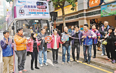 香港文匯報訊(記者 羅繼盛)「MTR is coming to Town!」港鐵西港島線列車明日起將駛進堅尼地城。港鐵今日將為港島線西延舉行慶祝典禮,堅尼地城站東行首班列車則在明日清晨6時正開出。民建聯中西區支部昨在西區舉行「通車點滴話你知」花車巡遊,花車途經堅尼地城及石塘咀一帶,沿途向市民派發有關西港島線新車站的資料、車費表及轉乘優惠等資訊。數十名小童則穿上聖誕服飾「報佳音」,唱出由民建聯副主席、中西區區議員張國鈞改編自《又到聖誕》的歌曲,與區內居民一同分享西港島線即將通車的喜悅。