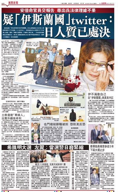 twitter©«¤å«ü¡A¡u¥Ñ©ó¤é¥»ªº¿ï¾Ü¡A«áÃð·¤G©M´ö¤t»»µæè³Q³B¨M¡v¡C¤é¥»¹qµø¥x(NTV)¬Q³ø¹D¡A¤@Ó¸g±`µo¥¬ISIL®ø®§ªººô¯¸¦b´Á«á¡A±i¶K¤@±iÅã¥Ü®ÉÄÁ˼Ƨ¹²¦ªº¹Ï¤ù¡A¦P®Éªþ¦³¨ä¥L³QISIL±þ®`¤H½èªº¦å¸{·Ó¤ù¡A·í¤¤¨S¦³¤é¥»¤H½è¡A´¨¥¡uISIL¥¿¥Î¾U§Q²´·ú¨nþÓ¡A§Ṳ́£·|¹ï2¦W¤H½è¤¯·O¡A¤Ú®æ¹F}(ISIL»â³S)¤Î¤h§L»¡¨ì°µ¨ì¡v¡C