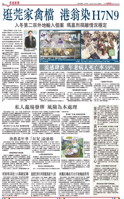 衛生署衛生防護中心總監梁挺雄昨晚宣布,正調查本港入冬以來第二宗外地傳入人類感染H7N9禽流感個案。該名79歲男病人過往健康良好,本月5日獨自到訪廣東東莞樟木頭,其間曾到過一個有活家禽攤檔的濕貨市場,但沒有直接接觸家禽。