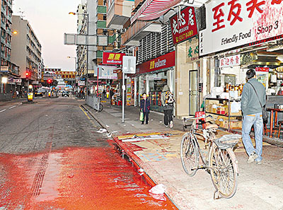 昨凌晨4時25分,該點心連鎖店位於上水和風街21號的分店,被一名年約20餘歲男子從外投擲一個載有紅色漆油的膠袋「漆油彈」,爆開後弄得該店招牌及對開地面滿布紅漆,歹徒得手後逃去,52歲姓馬女負責人立即報警。