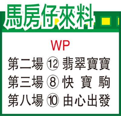 第八場、第三班、一六五○米。「由心出發」今季兩戰兩捷,途程為田草千二及千四,雖然均以短距離贏對手,但從跑法所見,牠是匹非常有鬥心之馬,今次刻意轉戰谷草一哩,幕後對牠的長力相當有信心,料可締造季內三出三捷佳績。