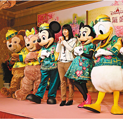 ■薛玉卿與換上新年裝的「迪士尼朋友」「拜早年」。 袁楚雙 攝