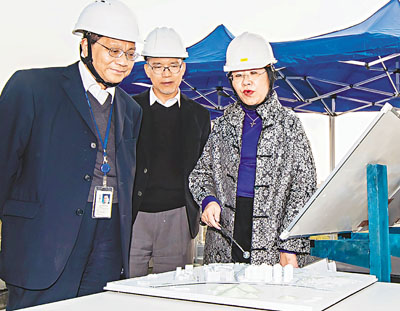 張炳良(左)昨日視察洪水橋公屋地盤,由房屋署副署長馮宜萱(右一)講解項目進展。