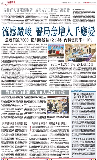 香港文匯報訊(記者 葉佩妍、鄭伊莎)「奪命」流感繼續肆虐,截至昨午12時,流感嚴重個案累計已達207宗,當中134人死亡,大部分為長者。醫管局聯網服務總監張偉麟昨日表示,現時醫院急症室每日求診人數高達逾7,000人,內科使用率亦逾110%,情況較過往數年嚴重,令急症室及內科病房「迫爆」,不少病人甚至要「瞓走廊」。張形容現時本港流感情況「嚴峻」,醫管局已推行多項應變措施,包括招聘護士學生及邀請已退休的支援服務職系員工協助應付,並會增加超時服務津貼。