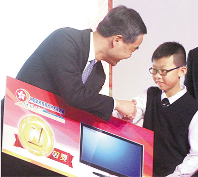 順德聯誼總會譚伯羽中學中一學生曾希藍,首次參加評選活動即中「頭獎」,頻呼「神奇」。只得12歲的他,上台領獎時,台上台下一片驚呼。頒獎嘉賓特首梁振英似乎也很好奇,不時低頭與他「密密傾」。曾希藍笑說:「他問我今年幾歲、讀幾年班、獎品是什麼?」