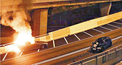 香港文匯報訊 (記者 杜法祖) 觀塘繞道昨凌晨發生懷疑非法賽車引發兩車相撞並茪黦N外,一輛跑車嚴重焚毀,兩車司機俱告受傷,警方正調查事件是否涉及非法賽車。