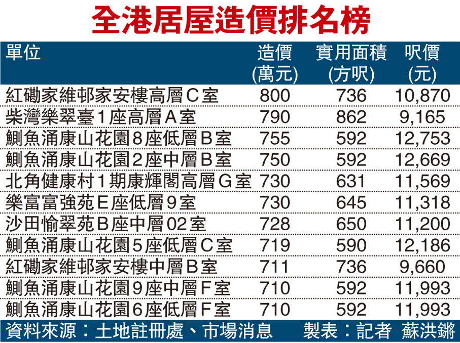 全港居屋造價排名榜 (圖)