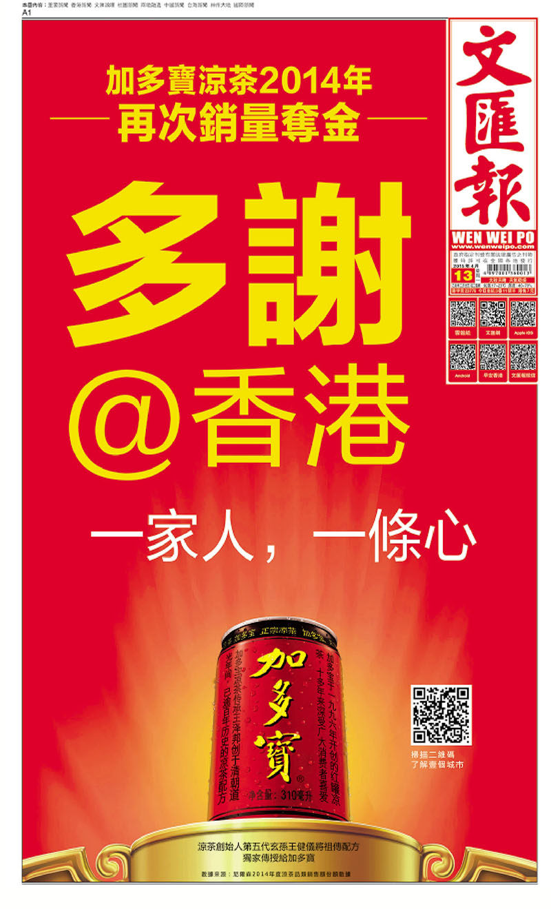 ■加多寶涼茶在本報刊出的頭版廣告