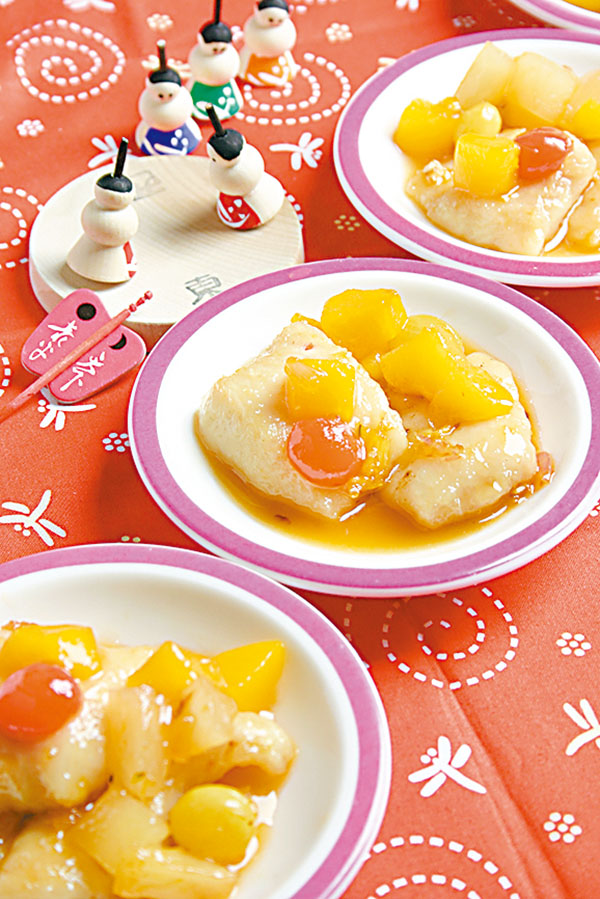 3.將調味拌勻倒入鑊中,加入罐頭雜果,炒至汁液轉濃即成。