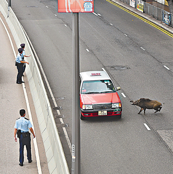 一隻重約70公斤野豬昨日清晨5時許在香港仔海濱公園「散步」其後四處亂竄,數度衝出有6條行車線的香港仔海旁道,弄得路過車輛慌忙閃避,險些釀成車禍。警員趕到出動盾牌陣意圖把野豬包圍,但野豬左衝右突逃入花圃躲藏,令警員束手無策。事件擾攘4小時後,野豬才在一幢工廈被圍困停車場內,被獸醫以麻醉槍制服。 ■杜法祖