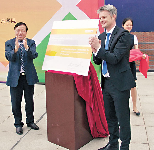■賀樂賦(右)和秦如培共同為貴州微軟IT學院授權點揭牌。 本報貴州傳真