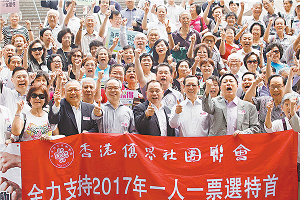 ■香港僑界社團聯會舉辦「全力支持2017年『一人一票』選特首」活動。 曾慶威 攝