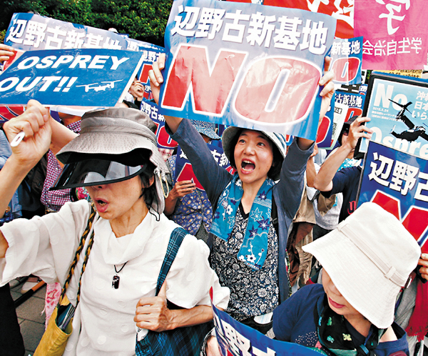 示威者身穿或手持象徵邊野古蔚藍大海的藍色物件,高舉「不要邊野古基地」、「安倍政權破壞憲法難以原諒」等標語,佔據國會四周主要道路。邊野古所在的名護市市長稻嶺進發表演講指,日本政府無視沖繩民意,令人懷疑日本是否真正的民主國家。示威者還反對美軍計劃在東京橫田基地部署CV-22「魚鷹」運輸機。目前有20多架「魚鷹」部署於普天間基地,令當地居民擔心安全問題。 ■法新社