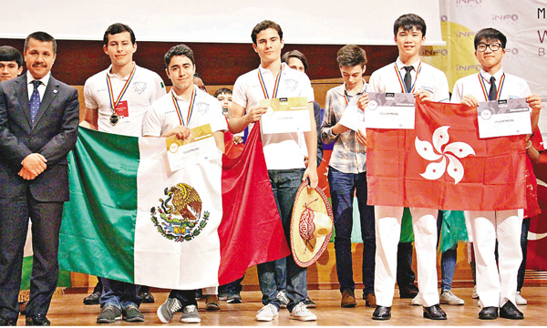■翁祐中學中五生李建樂(右二)和尹偉霖(右一)與金獎得主墨西哥隊合照。 校方供圖