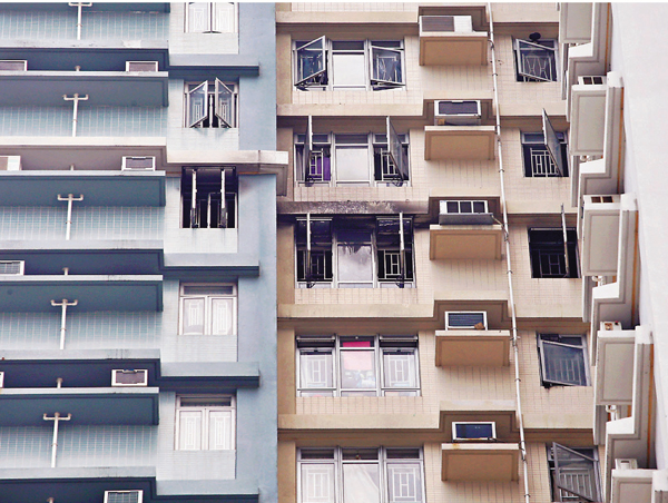 ■天水圍俊宏軒發生火警單位外牆遭熏黑。