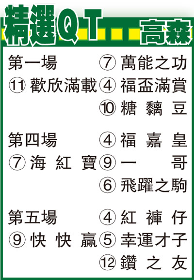 第四場、第三班、一二○○米。「海紅寶」剛戰首度轉爭泥地賽,路程千二米負重磅排一檔,出閘後隨即領放,就此一放到底大勝對手開胡,盡顯非凡場地性能,現用王牌瞄準勝途,決心謀連捷,屬可靠馬膽。「一哥」上仗敗後轉投蘇保羅馬房,看月初試泥閘走勢,起步後跟馬群中後位,末段移出外疊望空即自動湧前,狀態與泥地性能俱佳,有權即省招牌。