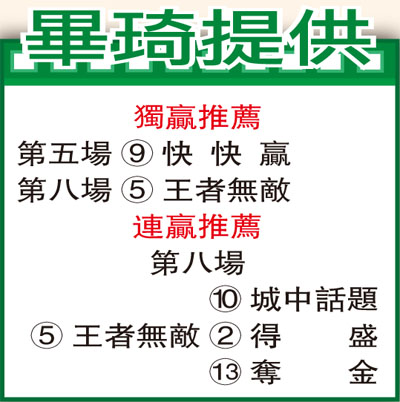 「王者無敵」助手在彭福公園踱一圈,捉住約束跟廄侶馬後慢行,伸長馬頸挺胸心火十足扯行,步伐展揚力雄渾,馬身更收紮實,毛色麗澤,朝氣蓬勃,狀態更上層樓。
