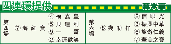 第四場、第三班、一二○○米。「海紅寶」之前在草地賽名次總在二至五名之間,以為是匹易位難贏的賽駒,沒料到上回轉戰此程竟能華麗轉身,排一檔起步,早段順勢擺頭領放操控步速,跑到最後四百米稍騎即能單騎表演,最終以五乘許大勝實力指標「麟轉乾坤」取得在港首場勝仗,末段跑出23秒42拉士屬全場最快,屬強組冠軍。勝後加13分兼升上三班,彰顯前景極受評磅員睇好,確認四歲仔找到最佳出路,有望在此場地創一番功業,四升三向來對此類當紮周歲精英無阻力,作膽依然可靠。