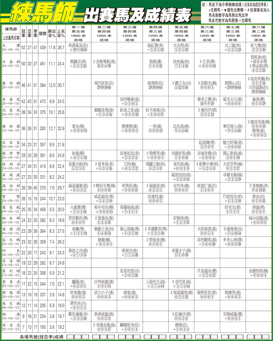 練馬師出賽馬及成績表